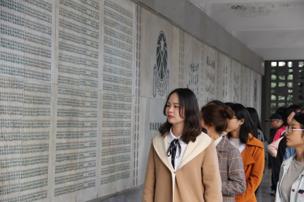 随后,孙德奇学长带领全体同学来到纪念馆,大家各自展开参观,看着那一个个历史物件,浮雕壁画,仿佛是穿行于血与火的虚拟空间,踏寻着战场上惊心动魄的一幕幕,感受整个战役的全过程,渐渐地,作为中国人名的自豪感浮上心头。