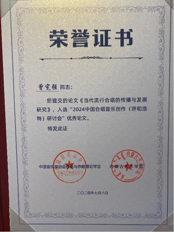 2024年7月6日至8日,“相聚北疆——2024中国合唱音乐创作(呼和浩特)研讨会”于内蒙古自治区呼和浩特市内蒙古艺术学院隆重举行。我院任佳老师精心指导的两位学生——2022级研究生李宇航与2021级本科生曾宪强,以敏锐的学术洞察力和创新的研究成果脱颖而出,双双荣获优秀论文,并受邀在大会上进行精彩宣讲,展现了我院在音乐创作研究领域的研究成果。