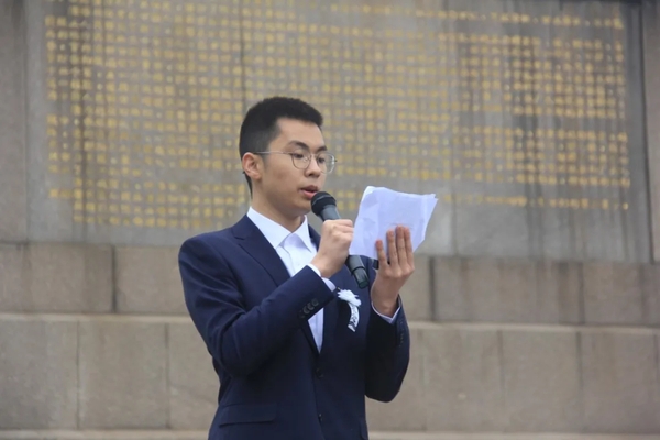 随后,机电工程学院学生代表曹展同学致悼词,表达对革命先烈的感恩、敬仰和追思。曹展同学发出倡议,作为一名时代新人,我们要铭记历史、缅怀先烈、传承红色基因、增强爱党爱国爱社会主义情感,激发奋斗向上的主旋律。