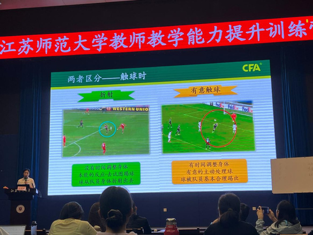在这次示范课上,王雪婷老师充分展示了其在足球教学领域的专业素养和创新能力。她以“越位”这一足球比赛中的重要规则为教学主题,运用丰富的智慧教学手段,通过思维导图梳理越位判罚的理论体系与判罚逻辑思维;通过图解,视频,动图等多媒体手段解析视频案例;通过模拟实践练习的方式,学生体验越位规则的判罚过程,在实践中加深了对越位规则的理解和应用。同时,将精益求精,一丝不苟的“工匠精神”贯穿课程始终,激励学生认真学习。生动形象地讲解了越位规则的基本概念和实际应用,使在场老师们对越位规则有了更加清晰、直观的认识。整个示范课过程中,王雪婷老师的教学话术和教学方式令人印象深刻,她运用通俗易懂的语言和生动的案例,将复杂的越位规则讲解得简单明了,使在场老师都能轻松掌握。