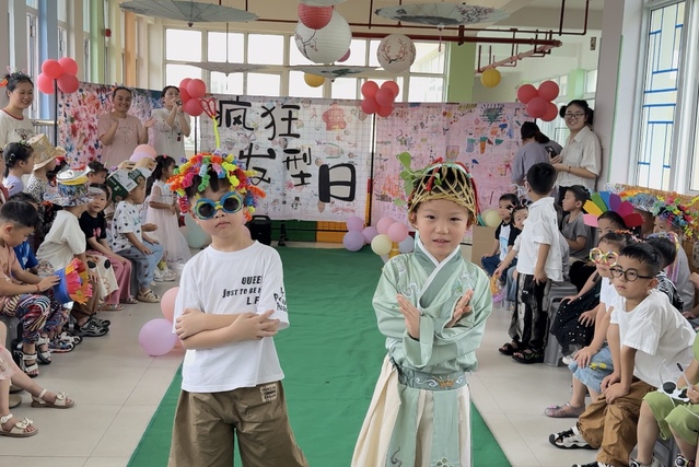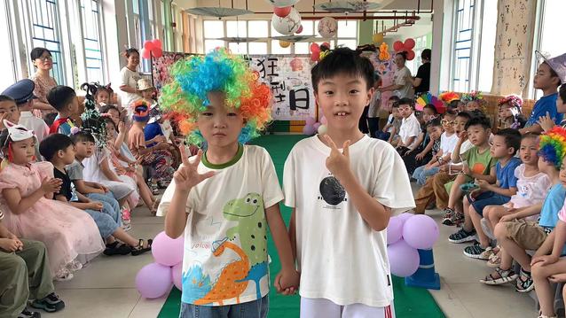 8月8日,江苏师范大学附属实验幼儿园的孩子们迎来了一个特别的日子——疯狂发型日。这是本学期的最后一天,也是一个充满欢声笑语的狂欢日。虽然天空不作美,但室内的热情丝毫不减,孩子们的创意和活力在这一天得到了充分的释放。