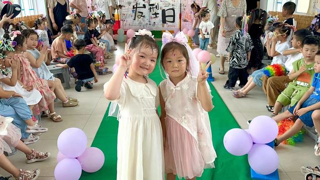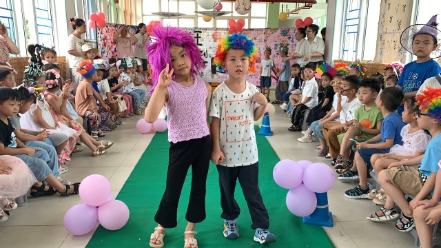 紧接着是中班的孩子们,他们的步伐虽然略显稚嫩,但同样充满了自信和快乐。他们的发型设计更加注重色彩的搭配和造型的趣味性,有的像盛开的花朵,有的头戴彩色卷发,有的在头上编满了花朵……每一个造型都充满了童真和梦幻。