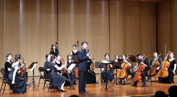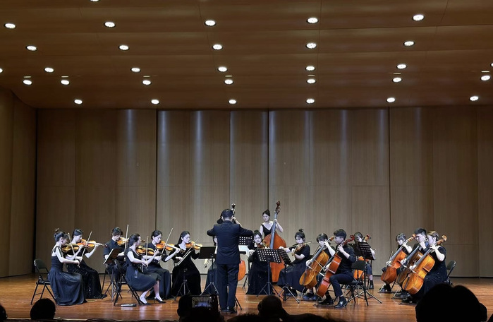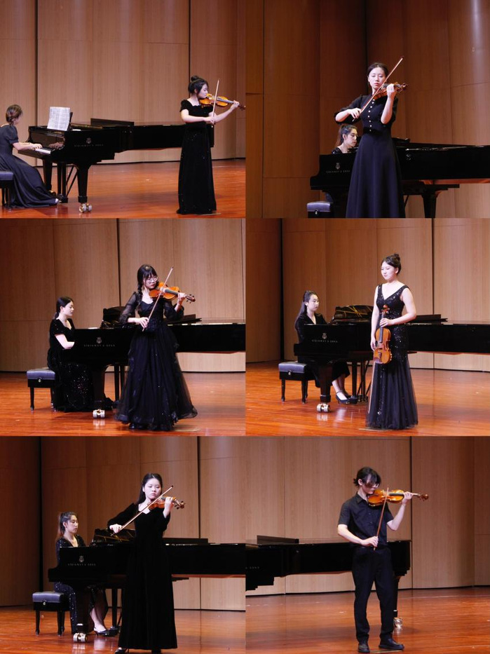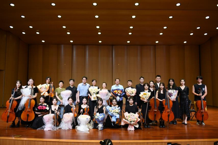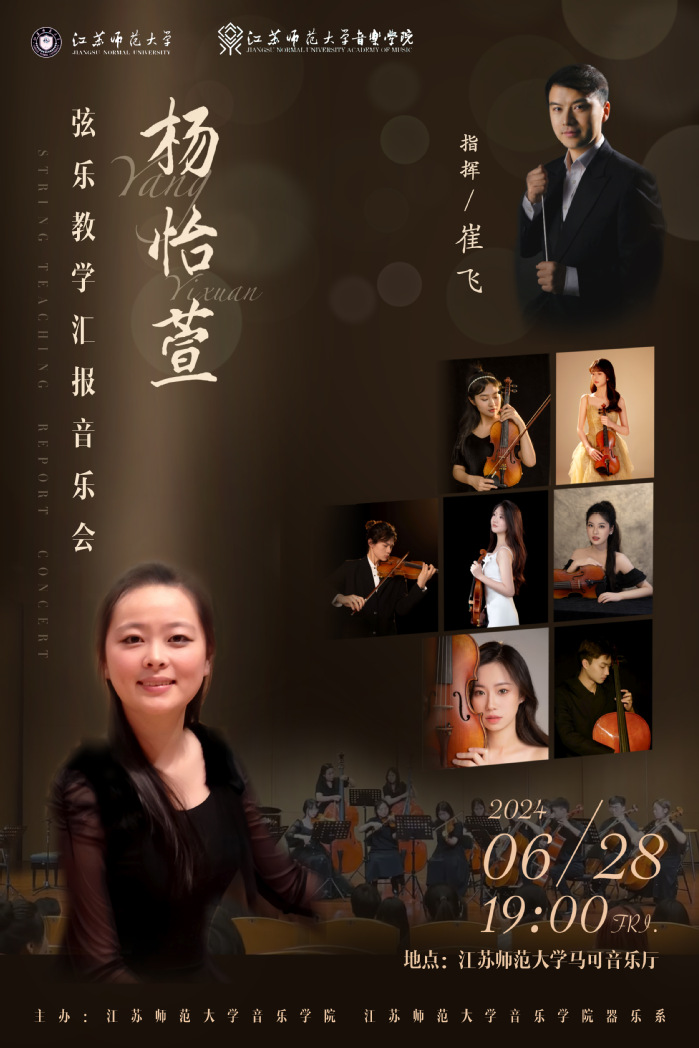 本场音乐会是我院本科、研究生弦乐教学成果的一次集中展示。音乐会的前半部分由音乐学院弦乐主项、副项本科生及研究生演奏了科马洛夫斯基、维尼亚夫斯基、莫扎特的经典小提琴协奏曲,以及中国作品《丰收渔歌》、《瑞丽江边》、《花儿为什么这样红》等;随后,演奏了我院王矛老师创作的弦乐四重奏作品《四叶雪小夜曲》;最后,由崔飞副院长指挥,携手杨怡萱老师及江苏师范大学音乐学院弦乐团共同为大家献上经典弦乐重奏改编作品《天空之城》、《一步之遥》、《我的太阳》等。