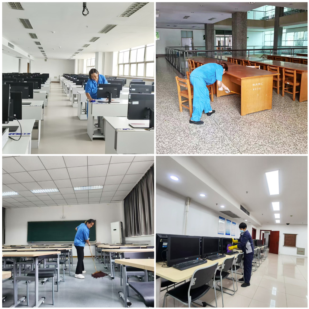 楼宇服务班组对泉山东、西校区各办公场所、教学楼内的公共区域、卫生间、杂物间、报告厅、会议室等进行卫生清理;对中心所管理的402间教室、57间大型公共计算机实验室、10000余平方学生自习场所进行深度保洁;完成所管理教室及自习室的设施查验及报修工作,补充粉笔、更换板擦。各楼保洁人员发扬不怕脏、不怕累的精神,坚持高标准严要求,做到环境卫生不留死角,清洁消毒不留空白。