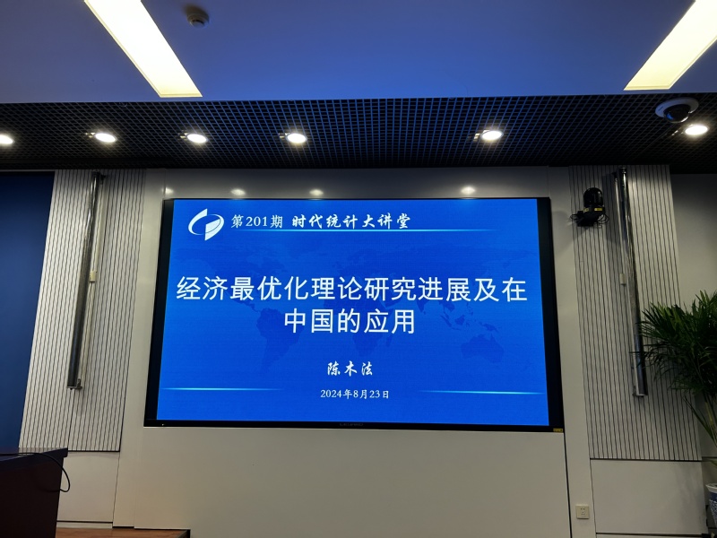 8月23日下午,国家统计局第201期时代统计大讲堂在北京举行。数学研究院院长陈木法院士应邀作题为“经济最优化理论研究进展及在中国的应用”专题讲座。本期时代统计大讲堂由国家统计局教育中心、中国信息报社联合举办,由中国信息报要闻部主任关逸民主持。陈先生的课题研究组谢颖超、陈彬、周勤、杨婷四位老师专程赴京参加这场报告会。
