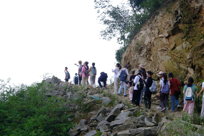 岳伟老师捡起山上一块小岩石,在户外为同学们上了一堂别开生面的地质学课,并教同学们通过地图判断这块岩石的可能产地。