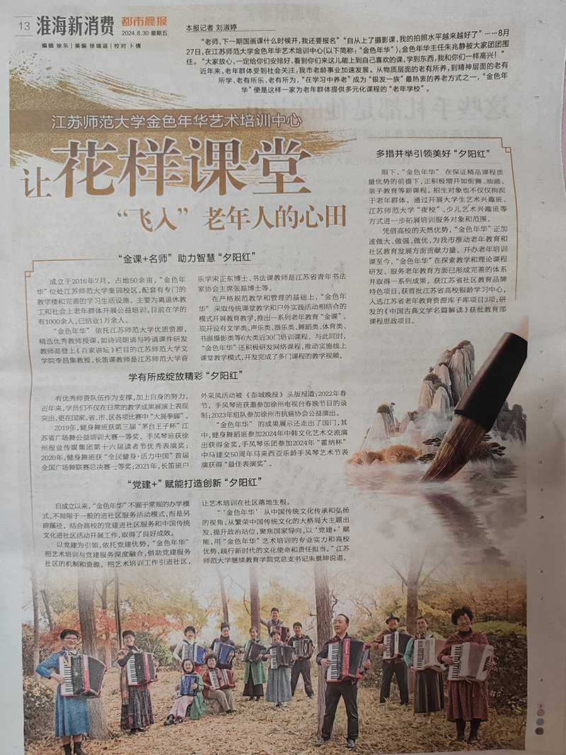 8月30日,《都市晨报》第13版专题报道我校继教院金色年华艺术培训中心(简称“金色年华”)典型做法。文章以《让花年课堂“飞入”老年人的心田》为题,通过《“金课+名师”助力智慧“夕阳红”》、《学有所成绽放精彩“夕阳红”》、《“党建+赋能”打造创新“夕阳红”》、《多措并举引领美好“夕阳红”》四个主题,对金色年华的优势特色品牌、教学成果展示、办学创新思路和未来发展前景做了详细报道。