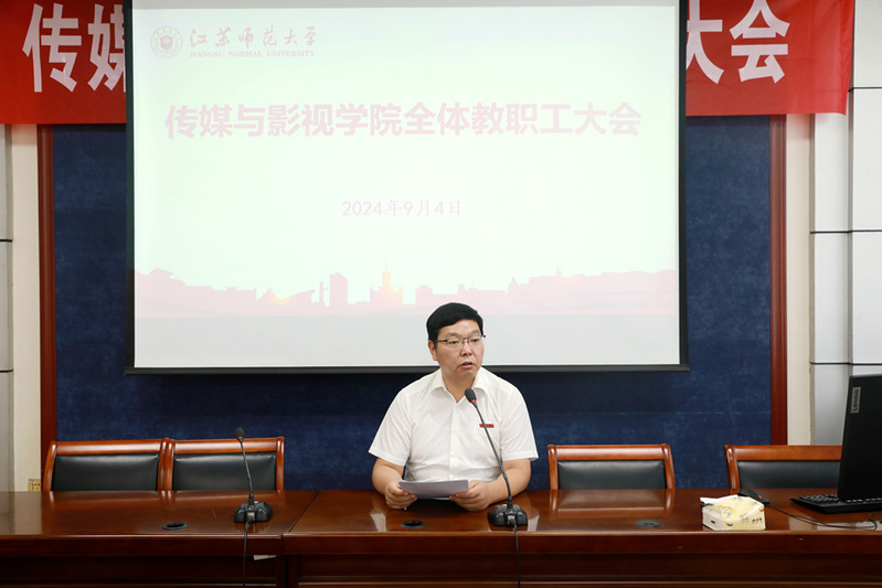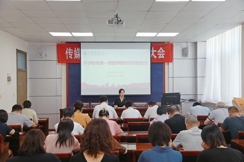 9月4日下午,传媒与影视学院召开“开学教育第一课”师德师风专题教育暨全体教职工大会。学院全体教职工参加会议。会议由院党委书记杜昀主持。