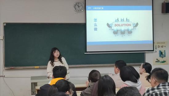 班会分为背景介绍、视频学习、分组讨论、总结发言、领导点评五个部分。班会伊始,丁永剑老师简要介绍了本次班会召开的“双重背景”,他结合2020年高校校园安全典型案例,讲述了身边安全隐患,引导同学们提高安全防范意识。接着,大家观看了校园安全与校园电动车安全专题视频,对校园安全与校园交通秩序有了更加全面深刻的理解。然后,丁老师带领同学们分组对校园人身安全、校园金融安全、校园交通秩序展开交流讨论,在分组交流中同学们各抒己见,热烈讨论,并推出小组发言人做小组汇报。在总结发言中,丁老师结合各小组汇报交流,倡导同学们牢固树立安全意识,做到文明有序出行,从身边小事做起,践行“人人为我,我为人人”的理念,共同维护和营造安全稳定的校园环境。