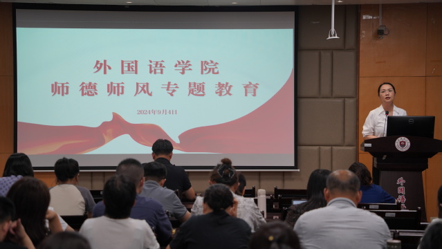 9月4日下午,外国语学院开展开学教育第一课暨师德师风专题教育活动。学院党委书记庄园带领全体教职工重点学习了《中共中央 国务院关于弘扬教育家精神加强新时代高素质专业化教师队伍建设的意见》,外国语学院全体教职工参加学习。