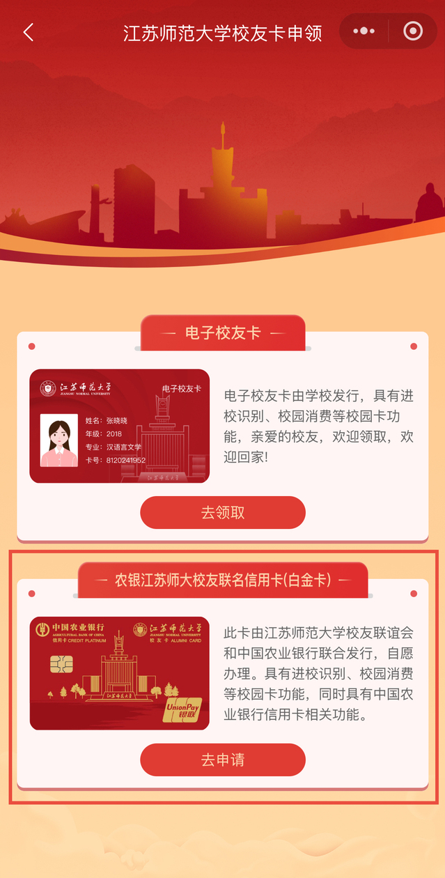 ☉线上申领。登录“江苏师范大学校友会”微信小程序,点击“校友卡申领”,认证完成后,点击“农银江苏师大校友联名信用卡”,按页面提示办理。收到卡片后,持卡片及身份证到全国农行任一网点激活。