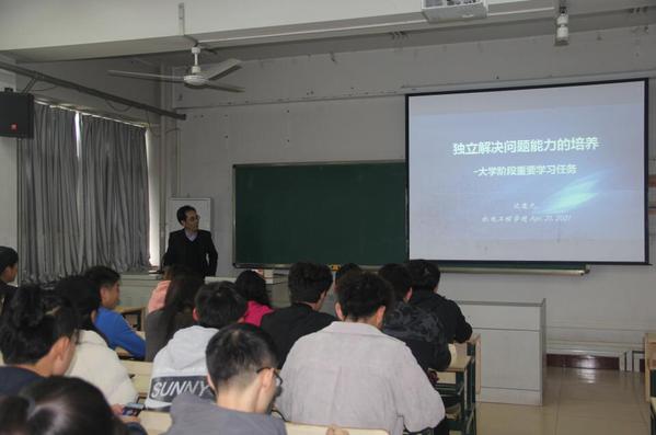 4月21日,泉山校区12号楼604C教室座无虚席,气氛热烈,校关工委讲师团理科组专家组成员沈德元教授正在为机电工程学院学生讲授题为“培养独立解决问题能力是大学阶段重要学习任务”专题讲座。本次活动由校关心下一代委员会主办,机电工程学院党委承办,是关工委讲师团理科组本学期在工科学院举行的首场讲座。