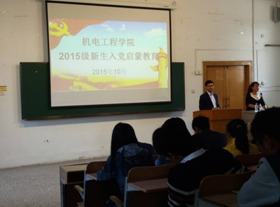 10月18日上午,机电工程学院举行新生入学教育系列活动之“入党启蒙教育”,校党委组织部专职组织员刘响来老师以“端正入党动机,坚定理想信念”为主题为我院2015级全体新生做了入党启蒙教育。