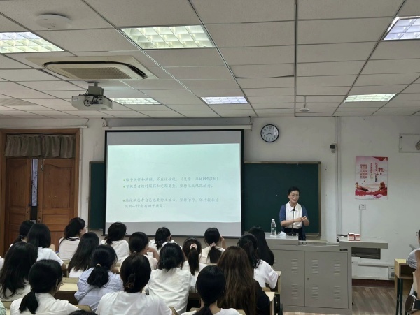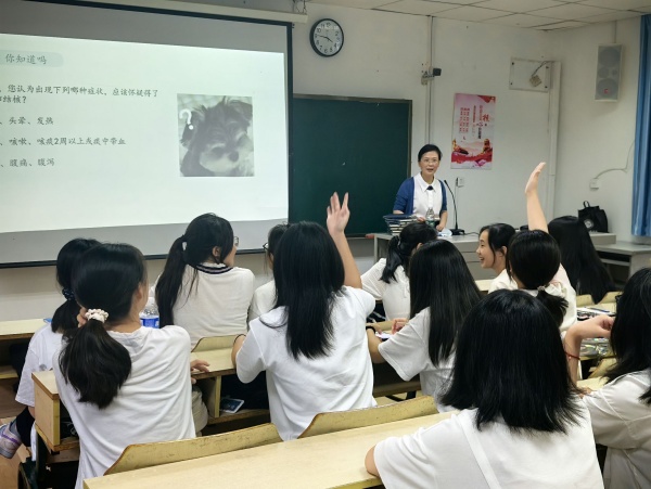 讲座伊始,李莉以湖南地区发生的相关事件引入了本次讲座的主题,深刻阐述了结核病对于学生学业的潜在危害性,以此引起同学们的重视。接下来,她围绕肺结核的特性、传播途径、常见症状以及防治办法等内容,以通俗易懂的语言和图文结合的形式详细科普了肺结核病相关知识,拓宽了新生们对肺结核的认识。同时,李主任建议大家要养成良好的生活习惯,保证充足的睡眠,合理膳食,保持健康心理,加强体育锻炼,增强机体抵抗力,使肺结核远离校园。讲座现场的气氛十分活跃,同学们不仅积极回答老师的问题,还勇于表达自己对结核病基础知识及校园防控措施的独特见解和深入思考。