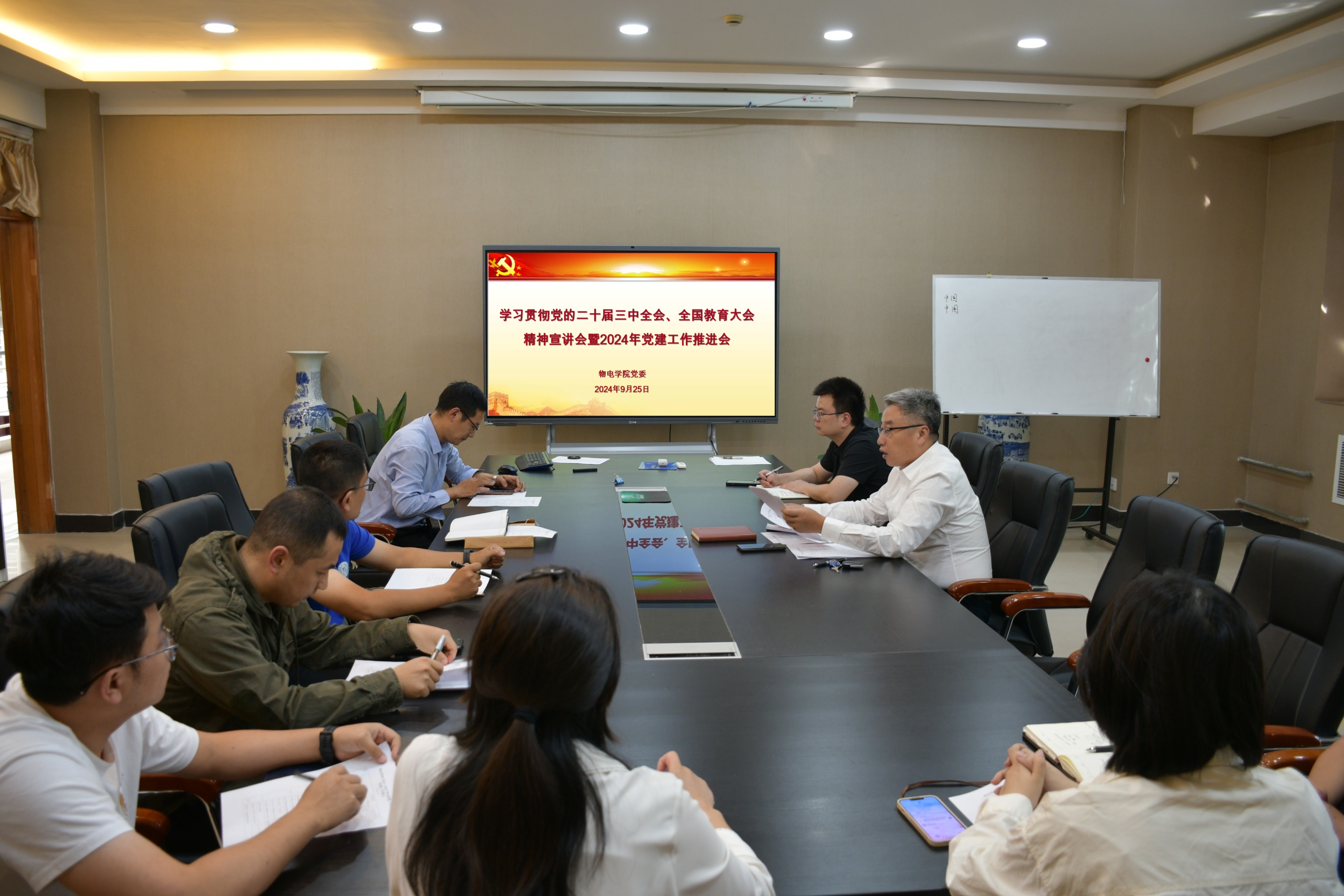 9月25日下午,物电学院召开学习贯彻党的二十届三中全会、全国教育大会精神宣讲会暨2024年党建工作推进会,学院各党支部书记、工会主席、妇委会主任、团委书记参加会议。会议由院党委书记王夫寿主持。