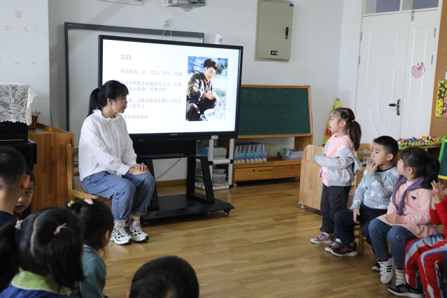 活动伊始,王雪雪老师先带领大家回忆了红色歌曲《童心向党》,并为到场的“客人老师”表演了手势舞。接着让小朋友们分享自己对党的认识,并在自由讨论中,得出了正是因为有了中国共产党领导,我们的祖国才成为富强民主、文明和谐的社会主义现代化国家。伟大的政党离不开英雄的党员。随后王老师聚焦案例,回顾了革命年代优秀共产党员雷锋战士舍己为公、无私奉献、在平凡的岗位上创造出不平凡业绩的英雄事迹,并教唱了红色歌曲《学习雷锋好榜样》。在其他党员的协助下,小朋友们学习并表演了歌曲及手势舞,之后,幼儿园党员教师代表郑老师组织小朋友和支部全体党员在五星红旗下合影留念。