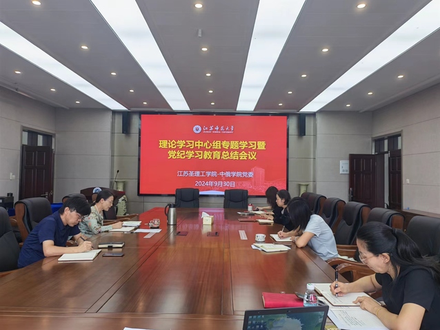 9月30日上午,江苏圣理工学院-中俄学院党委理论学习中心组在学院525会议室开展了理论学习中心组第八次专题学习暨党纪学习教育总结会议。本次学习由党委书记尹燕萍主持,党委委员、领导班子成员参加。