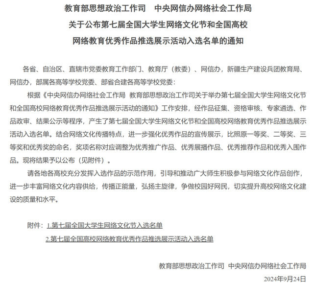 该活动自2023年9月开展以来,通过省级教育工作部门推荐、教育部直属高校及部省合建高校推荐、个人(团队)自荐三种渠道,共征集到来自31个省(区、市)和新疆生产建设兵团的50771件作品,以实际行动全面贯彻落实党的二十大精神,推动网络文化的健康发展。根据工作安排,经作品征集、资格审核、专家遴选(初选、复选、终选)、作品政审、结果公示等程序,最终产生了第七届全国大学生网络文化节和全国高校网络教育优秀作品推选展示活动入选名单。