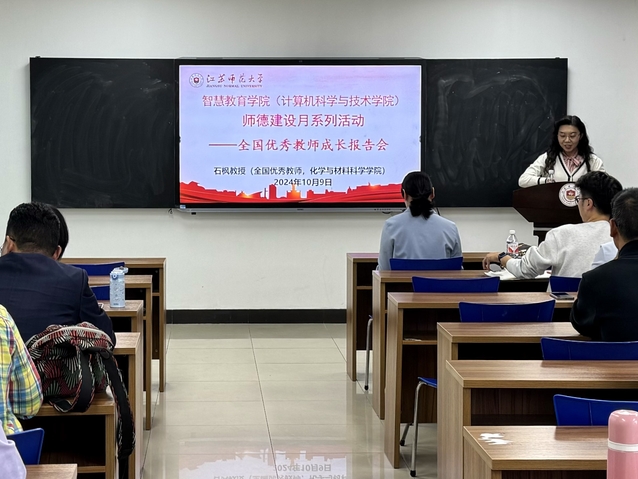 为落实校院关于开展以“大力弘扬教育家精神,加快建设教育强国”为主题的第 25个师德建设月活动安排,2024年10月9日,智慧教育学院(计算机科学与技术学院)在静远楼906报告厅举办了全国优秀教师成长报告会。此次活动旨在进一步夯实教师的思想政治教育与师德师风建设,提升教师的职业素养和教育教学能力。报告会由全国优秀教师、化学与材料科学学院石枫教授主讲,学院党委副书记武悦主持活动。