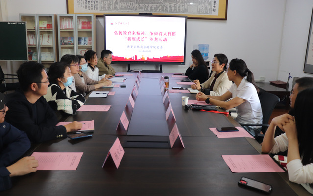 为进一步落实习近平总书记在全国教育大会上的重要讲话精神,引导全体教师弘扬教育家精神,践行立德树人使命,2024年10月9日,历旅学院举行了“弘扬教育家精神,争做育人楷模”新雁成长沙龙活动,特邀首届、第三届校“立德树人奖教金”获得者,校“师德模范”:马克思主义学院教授印少云、历旅学院教授蒋保,围绕“三尺之台,攀登一生”及“躬耕教坛守初心,强国有我志不渝”主题,为青年教师讲述自身从教体会、分享育人经验。学院党委书记戚洪主持本次活动。