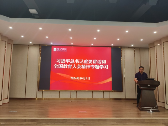 2023年10月9日下午,美术学院开展习近平总书记重要讲话和全国教育大会精神专题学习,学院领导班子、全体教职工参加学习会,本次会议由学院党委书记李亚东主持。