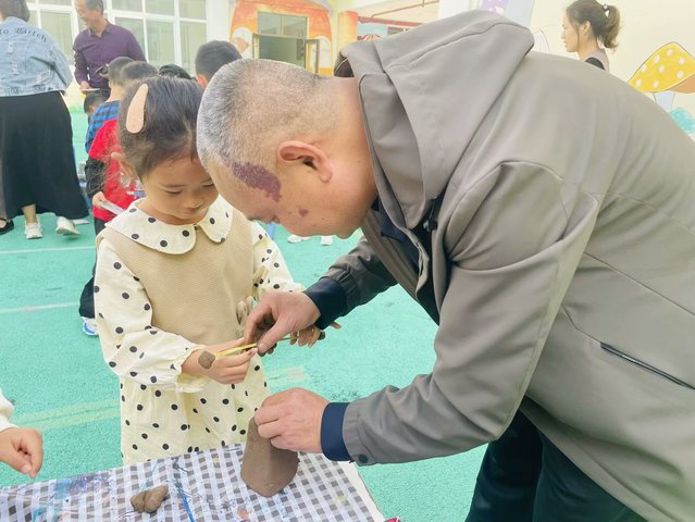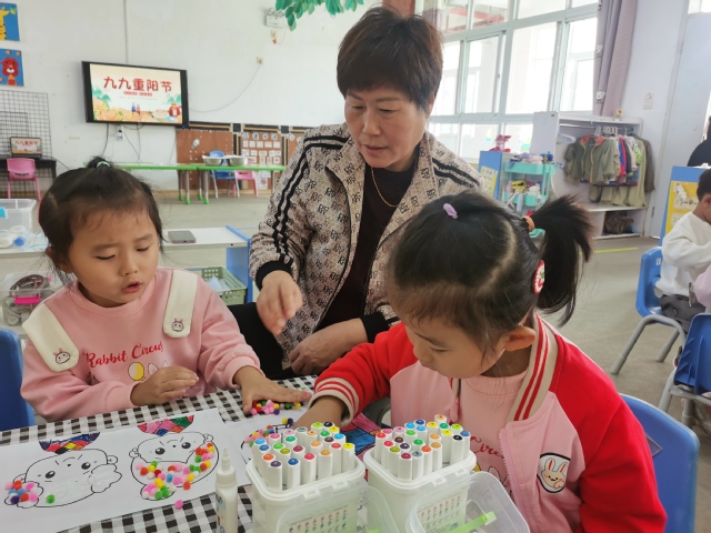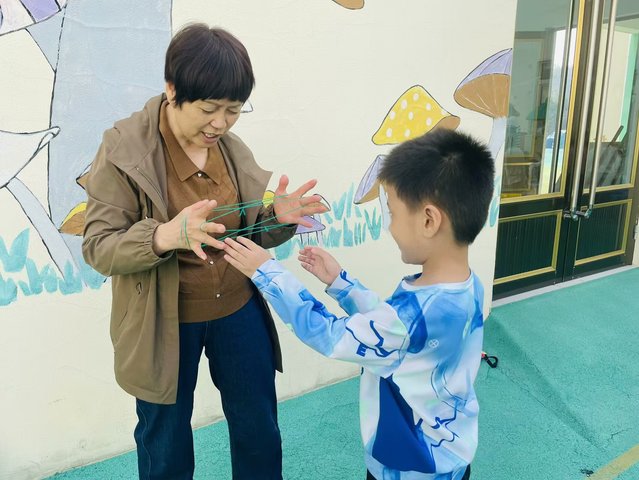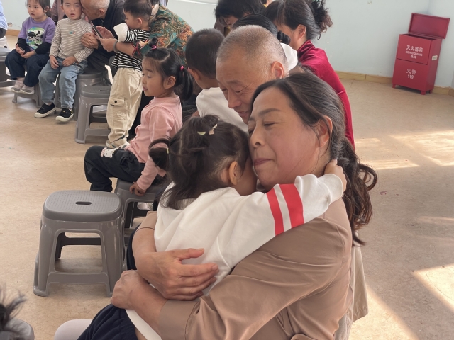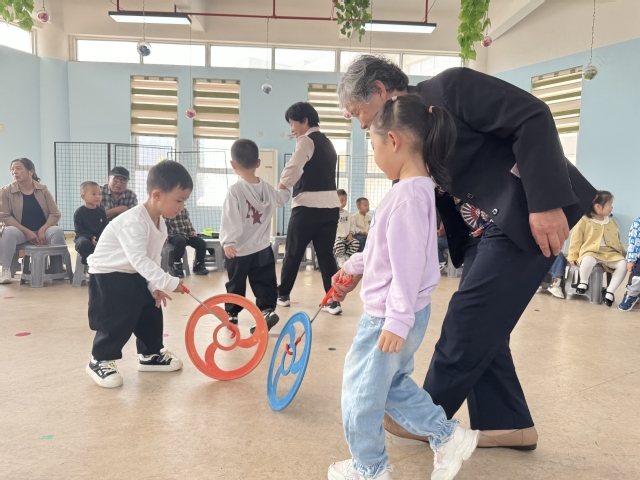 中班组的活动则更加注重传统文化的传承。老师先为孩子们介绍了重阳节的由来和习俗,通过生动的故事和有趣的互动,让孩子们对重阳节有了更深的了解。接着,一场庄重的敬老仪式开始了,孩子们用稚嫩的小手为爷爷奶奶们捶背捏肩,表达着对长辈的感激和尊重。在亲子游戏环节,孩子们和爷爷奶奶们一起动手做手工、翻花绳,又或是一同在户外滚铁环、翻纸杯,不仅增进了亲子之间的感情,也锻炼了孩子们的动手能力和团队协作能力。看着孩子们和爷爷奶奶们默契的配合和欢快的笑声,仿佛时间都停留在了这一刻。