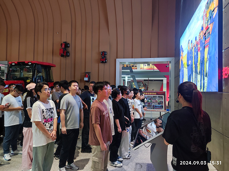 本次实习的第一站是参观中国一拖东方红农耕博物馆。学生们进入博物馆后,映入眼帘的是习近平总书记“把中国人的饭碗牢牢端在自己手中”的指示。博物馆陈列了商代的石铧犁、战国时期的铁犁以及唐代的曲辕犁,标志着我国传统农耕发展成熟。直到新中国成立之初,为改变农业落后的面貌,1953年1月,中央决定筹建第一个大型拖拉机制造厂,并提出年产2万台的设计纲领。随后,在苏俄专家的帮助下,中国一拖员工攻坚克难掌握技术,完成了新中国农机工业的重要奠基。自中国一拖诞生之日起,党和国家领导人给予很多的关怀和嘱托,这激励着中国一拖人勇于奉献、开拓进取,为中国农机现代化增砖添瓦。