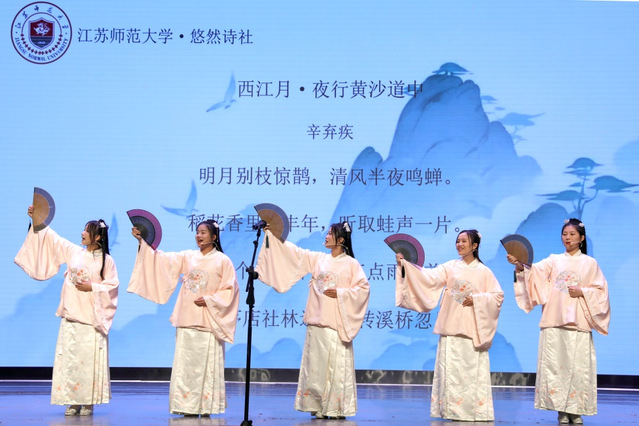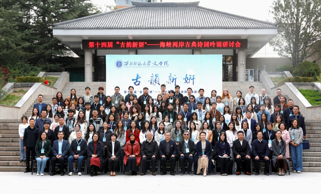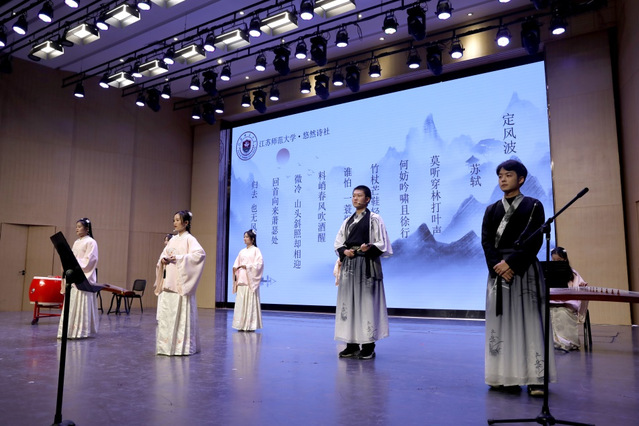 2024年10月12日至13日,江苏师范大学文学院“悠然诗社”师生赴甘肃兰州参加由西北师大主办的第十四届“古韵新妍”——海峡两岸古典诗词吟诵研讨会。共同参会的还有北京师大、中南大学、陕西师大、台湾辅仁大学、淮阴师院、甘肃民族师院、邯郸学院共9所高校的百余名师生。大会主题发言结束以后,第十四届海峡两岸古典诗词吟诵展演活动在西北师大音乐厅正式开始。9家诗社共同完成了由27首经典诗词组成的中华古典诗词吟唱盛会。“悠然诗社”吟唱了苏轼的《定风波·莫听穿林打叶声》和辛弃疾的《西江月·夜行黄沙道中》,优美的舞台设计、悠扬婉转的唱腔,生动诠释了诗词吟唱的内涵,赢得了现场观众的阵阵掌声。