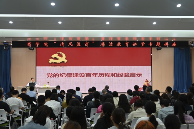 为学习贯彻习近平总书记对党纪学习教育的重要指示精神,落实上级党组织廉洁教育的部署和要求,推动党纪学习教育常态化长效化和廉洁文化建设,10月16日下午,商学院开展“清风盈商”廉洁教育讲堂专题讲座,校机关党委书记王丰应邀做专题报告,院领导班子全体成员、全院师生党员和入党积极分子参加报告会,院党委书记钱程主持会议。