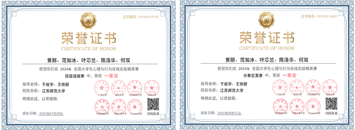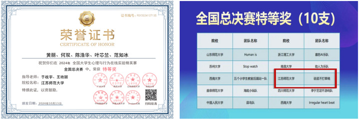教育科学学院应用心理学专业师生积极参赛,本科生与研究生共有6支队伍参与了校内选拔。经过学院组织的专家匿名评审,最终“说谎不打草稿队”与“海底小纵队”荣获校赛一等奖,并成功晋级东部赛区分区赛。在分赛区期间,两支队伍高效完成了600余名被试的实验数据收集与分析,并在教师的指导下进一步优化研究报告,最终荣获分赛区一等奖。