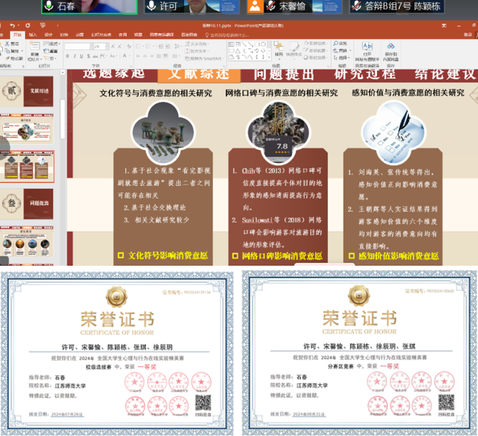 在国赛备赛期间,两支队伍在教师的进一步指导下,从PPT制作、汇报逻辑、研究问题的提出以及可能遇到的问题等方面进行了全面准备。2024年10月13日,第二届全国大学生心理与行为在线实验精英赛总决赛正式拉开帷幕。比赛采用线上答辩、线下评审相结合的方式,邀请了来自高校的十五位评审专家,确保了比赛的公正性。最终,我院“说谎不打草稿”队伍凭借卓越的研究设计和扎实的实验分析,荣获“全国总决赛特等奖”,“海底小纵队”获得“全国总决赛三等奖”,于战宇老师荣获“年度十佳指导老师”称号。同时,石春、于战宇、王艳丽三位老师被授予“优秀指导教师”称号。
