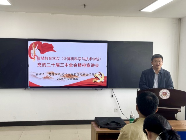 为深入学习贯彻党的二十届三中全会精神,2024年10月16日,智慧教育学院(计算机科学与技术学院)邀请校党委理论宣讲团成员、公共管理与社会学院楚德江教授在静远楼906报告厅作宣讲报告。学院领导班子、全体教职工党员、学生党员代表参会,宣讲会由学院院长董永权主持。