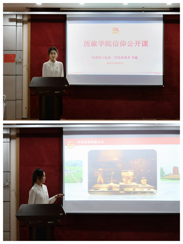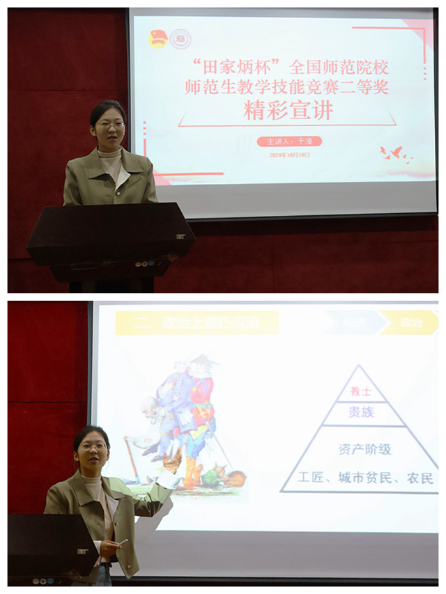 培训伊始,于潼针对《如何上好一节历史课》进行了详细讲解阐释,分享了在田家炳教学技能大赛上的心得体会。她以初中教材中“法国大革命的背景”一课为例,带领同学们分析了法国大革命爆发的政治、经济与思想文化因素,并通过插入漫画、引用名人名言等方式增强了课堂的趣味性,通过现场提问提升了课堂的互动感,帮助在场同学深入感受到了作为师范生在历史课堂上应必备的综合能力与核心素养。随后,李越结合自身在思政大比武上的经验,针对《如何上好一节团课》进行了范例展示。李越同学围绕“文化自信”这一主题,细致阐述了习近平文化思想的内涵与意义,将文化实例与理论指导相结合,带领同学们探究了新时代推进我国文化建设工作的根本方法。最后,参与培训的同学们针对培训主题积极提问讨论,对历史课堂的教学要求与团课的思想核心展开了深入的学习探究。