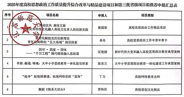根据《省教育厅办公室关于做好教育部2025年度高校思想政治工作质量提升综合改革与精品建设项目和第三批省级项目申报工作的通知》(苏教办社政函〔2024〕23号)、《关于征集报送省教育厅2025年度高校思想政治工作质量提升综合改革与精品建设项目的通知》安排,经个人申报、单位推荐、校级遴选,拟推荐以下6个项目申报,现公示如下。