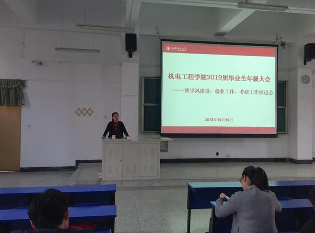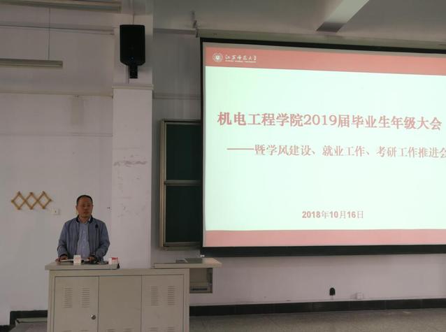 10月16日下去2:00,机电工程学院于17#200D召开2019届毕业生年级大会暨学风建设、就业工作、考研工作推进会。机电工程学院2019届204名毕业生参加了此次会议,机电工程学院党委副书记梁宝文、教务老师刘凤国、就业辅导员丁永剑参加了年级大会。年级大会由2015级辅导员刘萌老师主持。