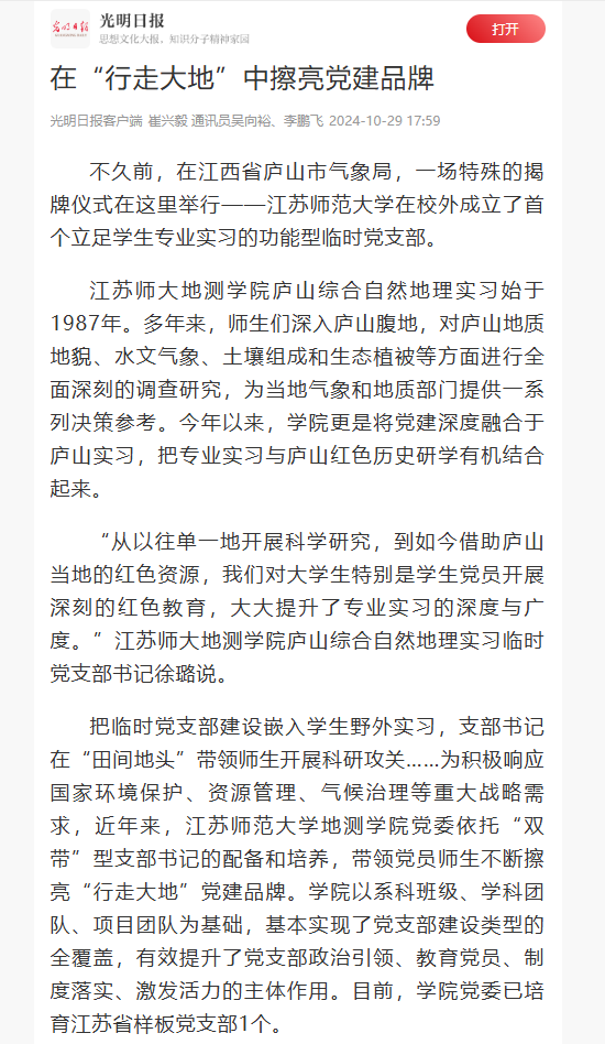 光明日报客户端10月29日报道我院持续擦亮“行走大地”党建品牌有关工作,深化党建引领,推动党建与业务工作深度融合,依托“行走大地”党建品牌理念,切实把党组织的政治优势、组织优势转化为发展优势,为学院以及学校高水平发展提供强有力的保障。报道内容如下: