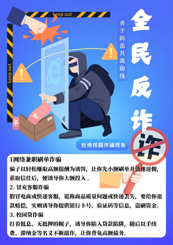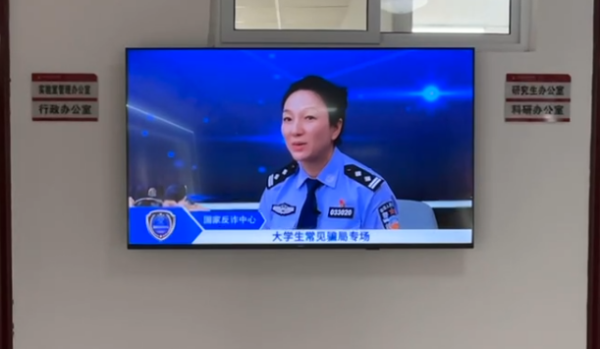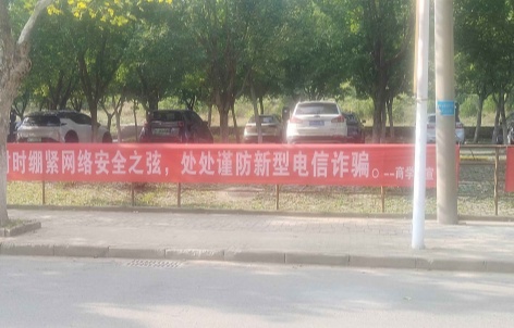 学院通过在路边悬挂横幅、在学院公告栏张贴宣传海报、利用学院大屏播放防骗提示等方式,将反诈宣传触角延伸到每一位师生身边,切实提升师生识骗、知骗、防骗的能力水平。
