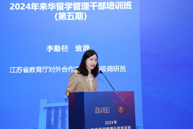 江苏省教育厅对外合作交流处调研员李勤径在致辞中表示,在教育部的指导和支持下,江苏省致力于打造教育强省,并将继续擦亮“留学江苏”品牌。她着重介绍了锦绣江苏品牌项目、悦读江苏—国情教育活动等方面取得的显著成效,并希望全国留管同仁借此机会,深入了解江苏的教育资源和文化特色,为江苏来华留学教育管理工作注入新的活力和灵感。