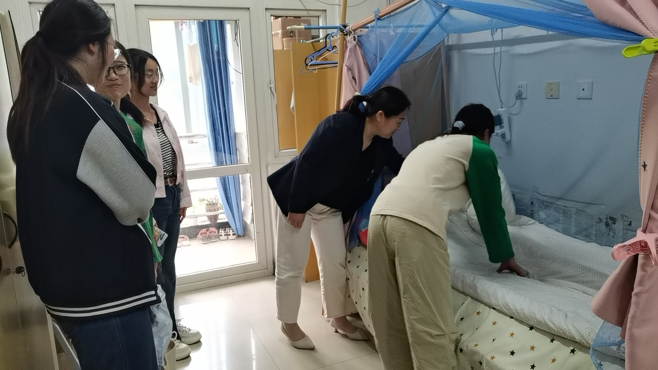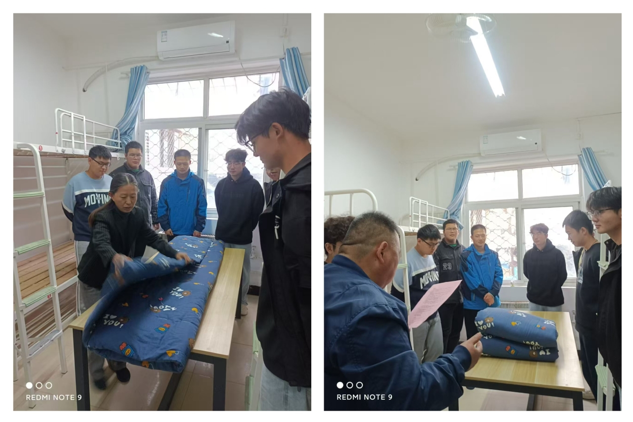 在内务整理活动中,宿管阿姨们认真指导,动作娴熟,不仅展示了被子整理的“叠、压、折、捋”几个关键步骤,还示范了桌椅、洗漱用品、书籍等物品的摆放,对桌面和床上物品的整理提出内务检查标准,同时展示样板间图例供同学们参考。参加学习活动的同学按照标准进行实操,在宿管老师手把手的指导和帮助下,同学们一丝不苟,认真整理,从书籍的排列到桌面物品的摆设,从衣物的叠放到杂物的收纳,再到床铺整理…在宿管老师和同学们的共同努力下,宿舍面貌焕然一新。
