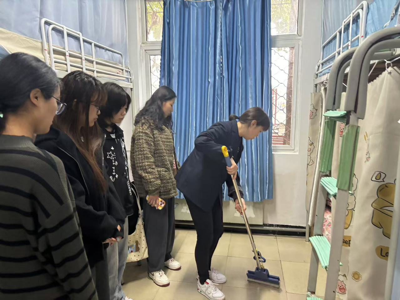 离开宿舍时,宿管老师不忘提醒同学们:宿舍内要勤通风、勤打扫,衣物勤洗勤晒,规范用电,日常相处互助友爱,共同营造良好的生活环境。
