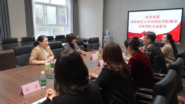 于涛院长代表学院对湖南科技大学外国语学院领导的到来表示热烈欢迎,并简要介绍了学院办学历程、学科建设、学术科研、人才培养等整体情况。禹玲院长感谢学院的热情接待,介绍了湖南科技大学外国语学院基本情况、学科专业特色,并期待未来双方以此为契机,加强交流合作,相互学习借鉴,共同实现高质量发展。