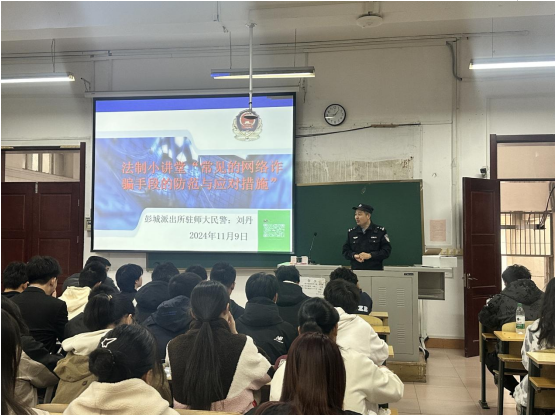 11月9日上午,为进一步提升学生的反诈意识与防诈能力,确保校园环境的安全稳定。公共管理与社会学院特别举办了一场防诈反诈专题讲座。本次讲座邀请了彭城派出所驻校民警刘丹担任主讲嘉宾,学院辅导员苗天添老师主持了活动,全体大一新生积极参与,共同学习防诈知识。