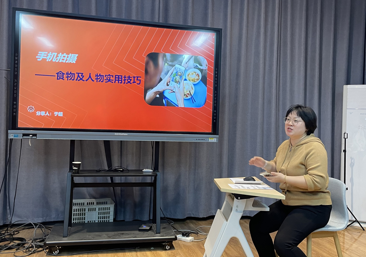 于超围绕拍摄“食物及人物实用技巧”主题,深入浅出地讲解了从食物和拍摄环境的选择、拍摄角度的把握、拍摄构图的巧妙设计到后期对食物色彩与光影的调整等一系列技巧。她结合饮食服务中心的日常工作实例,分享了如何捕捉食物的最佳状态、人物的生动表情以及通过构图以展现活动氛围等注意事项,不仅为摄影爱好者们提供了宝贵的拍摄指南,更激发了他们对摄影艺术的浓厚兴趣。
