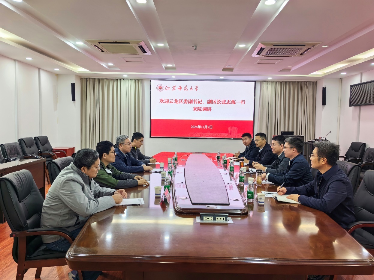 随后,调研团与物理与电子工程学院党委书记王夫寿及相关负责同志进行了交流座谈。王夫寿书记对调研团的到访表示热烈欢迎,并重点介绍了学院在科研平台建设、高层次人才培养、关键核心技术攻关等领域已经取得的成果,并期望能将本学院的优势学科与云龙区的重点产业深度对接,为云龙区社会经济发展提供有力支撑。王夫寿书记在校地融合发展,特别是在人才招引和产学研合作协同创新发展上提出了自己的理解和设想。张志海书记对学院在教学、科研等领域所作出的贡献,尤其是在激光材料和激光器件等方面取得的突破性进展给予了高度评价。他表示,区委区政府高度重视与江苏师范大学物电学院的合作,期待双方在科技创新、成果转化、人才集聚、平台载体建设等方面共同发力,持续深化校地融合,为云龙区发展提供强大动力。