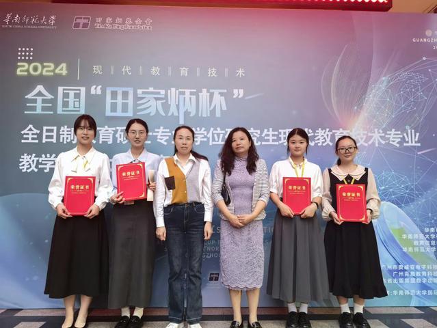 2024年11月8-10日,全国“田家炳杯”全日制教育硕士现代教育技术专业教学技能大赛总决赛在华南师范大学举行。我院4名2022级现代教育技术专业研究生在老师们的精心指导下,凭借扎实的教学功底和出色的现场表现,在众多参赛者中脱颖而出,取得了优异的成绩。研究生李宗欣荣获一等奖,段雨迪、高露荣获二等奖,吴新月荣获三等奖,王帆、王娟和安涛三位教师荣获“优秀指导教师”奖。