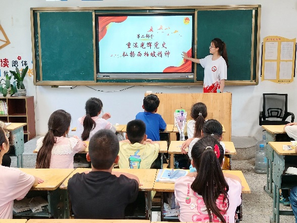 团队成员通过红色情景剧演绎、党的二十大精神知识问答、红色诗歌朗诵等形式,带领学生重温革命先烈激情燃烧的峥嵘岁月,激活流淌在血脉中的红色基因,进一步引导其坚定理想信念,增强传承革命薪火的历史责任感和使命感。