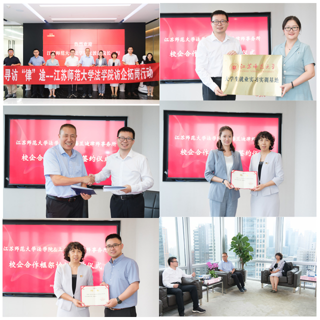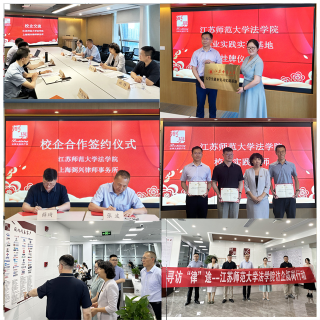7月11日至12日,法学院寻访“律”途一行4人抵达上海,深入上海弼兴律师事务所、上海佰特专利代理事务所、上海兰迪律师事务所、上海段和段(虹桥国际中央商务区)律师事务所、上海上股交投资咨询有限公司和知产前沿&合规Plus新媒体公司开展访企拓岗促就业活动。座谈会上,法学院各位领导分别学院历史沿革、办学特色、师资队伍建设、人才培养取得的标志性成果、学科建设、平台建设、校地校企共建成果等方面进行了介绍,期待双方充分发挥各自优势,继续在校所合作、人才培养、资源共享等方面加强交流,实现合作共赢。相关律所、事务所主任和公司领导表达了对于法律人才的强烈需求,期待能够与江苏师范大学法学院在更多领域、更深层次开展合作与交流,深入探索校所合作路径;资深律师们结合实际案例,就法学教育与法律实践的衔接、学生职业素养的培养以及律所对人才的具体要求等为学院的教学改革和人才培养方案提供了极具参考价值的建议。同时,相关单位纷纷表示愿意为法学院学子提供更多的实习和就业机会,共同培养适应社会需求的高素质法学人才。双方就共建大学生就业实习实训实践基地达成一致意向,举行了合作协议签约、授牌、聘任仪式。