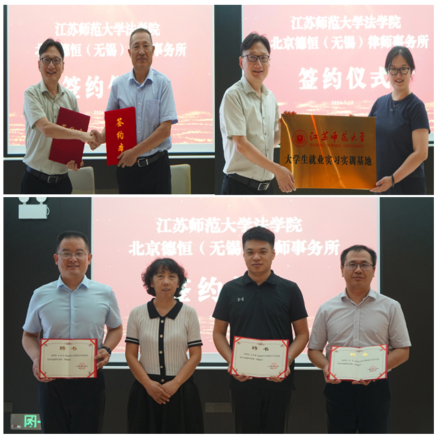 在江苏省无锡市,北京德恒(无锡)律师事务所主任王建明、监委会主任韩庆东、合伙人王国涛、汪浩瀚、张景旭、业务合伙人武斌等多名律师热情接待了张波副院长一行。王建明主任介绍了北京德恒(无锡)律师事务所的发展历程、业务范围、团队建设和公益服务情况,对我学院毕业生的工作态度和实践精神给予了充分的肯定,他表示,北京德恒(无锡)律师事务所将竭力为江苏师大学子提供广阔平台。张波副院长介绍了江苏师范大学法学院与政府机关、法律实务部门深化合作取得的丰硕成果,期待以此次与德恒(无锡)律所建立实习实训基地为契机,在学生实习就业、理论研讨、实务培训、社会服务、科研成果转化等方面深化务实合作,谋求共赢发展。双方就共建大学生就业实习实训实践基地达成一致意向,举行了合作签约、授牌、聘任仪式,并围绕合作共建、人才培养、发展前景等方面展开了深入座谈交流。