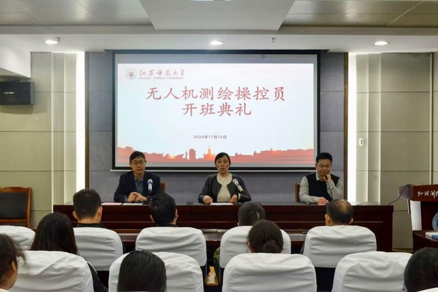 2024年11月16日上午,地理测绘与城乡规划学院2024年“无人机测绘操控员”秋季班开班典礼在静远楼1307会议室召开。学院党委书记耿艳、副院长梁亮、江苏师范大学职业技能培训和认定评价领导小组办公室主任、资产经营公司副总经理段培同出席典礼,无人机操作培训教师和无人机测绘操控员培训班的全体同学参加典礼,典礼由梁亮主持。