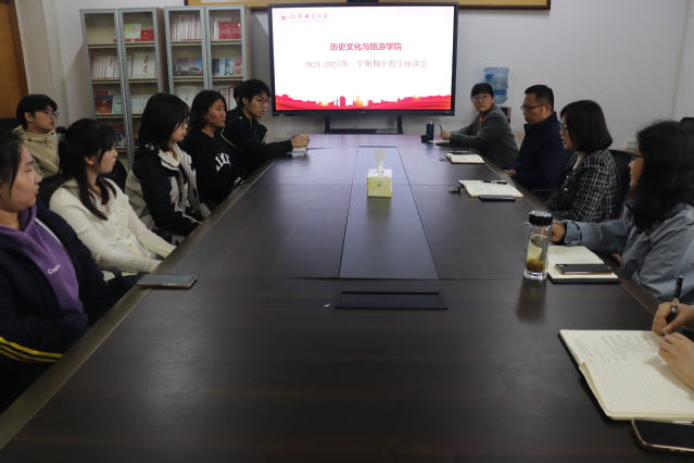 2024年11月14日下午,历史文化与旅游学院召开了期中教学检查师生座谈会。本次会议由教学副院长张红霞主持,历史系副主任张荣苏、文化产业管理系主任张培奇、旅游管理系副主任谢五届、辅导员周鑫老师以及全体本科班级的学习委员参与了本次座谈。